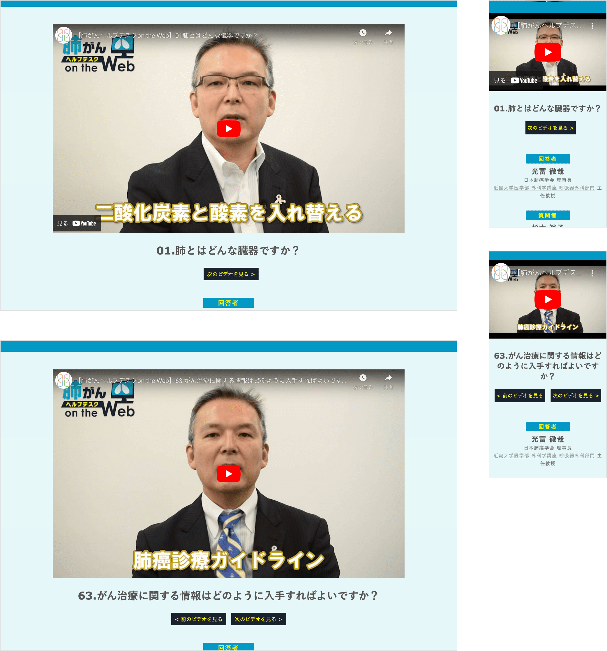 肺がん向上委員会(特定非営利活動法人日本肺癌学会)が提供する公式動画プログラムです。全74のテーマについて各3分以内で解説。短い動画で、手軽に視聴しやすいという最近のニーズを掴んでいます。